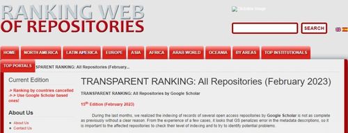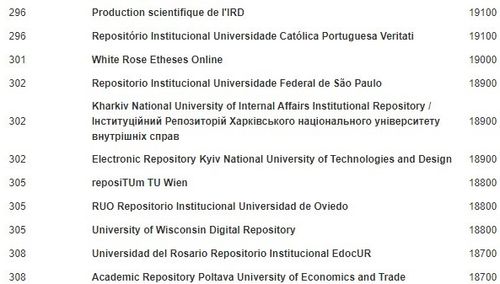 Іспанська лабораторія Cybermetrics Lab, яка є автором рейтингу Webometrics, опублікувала черговий, випуск рейтингу репозитаріїв від Google Scholar – Ranking Web of World’s Repositories. Метою рейтингу є підтримка ініціативи відкритого доступу до наукових видань та інших академічних матеріалів в електронній формі, оцінка рівня відкритості академічних ресурсів та їх інтеграції у світовий інформаційний простір.