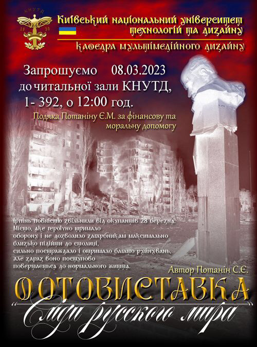 Запрошуємо до читальної зали бібліотеки (ауд. 1-0392) 8 березня 2023 р. о 12:00 на персональну фотовиставку старшого викладача кафедри мультимедійного дизайну Потаніна Станіслава Євгеновича - Рік війни.